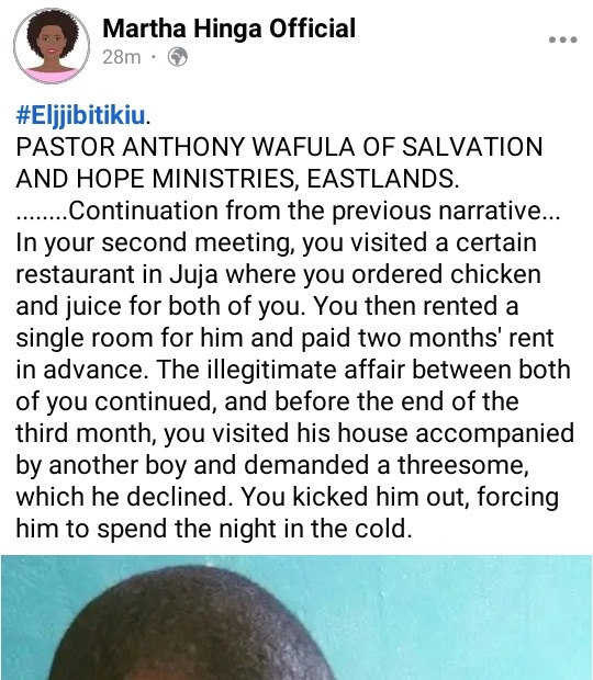 A Kenyan pastor identified as Anthony Wafula has been exposed by Kenyan blogger Martha Hinga for practicing gayism. According to the allegations seen on her facebook page, the pastor, who preaches at Salvation and Hope Ministries in the Eastlands, is alleged to have been practicing gayism with a boy whom Martha Hinga did not expose.